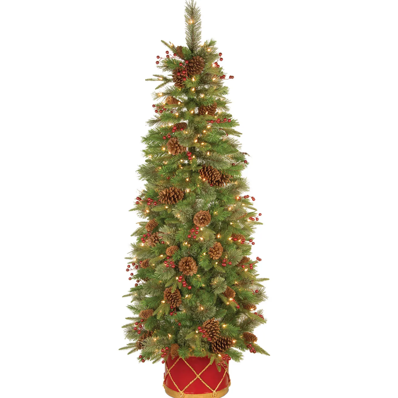 This Colonial Slim Half Tree features a flat backside designed for display against a wall or where floor space is limited. It also features Feel Real branch tip technology, creating a tree with remarkable realism. It is pre-lit with 200 clear lights and trimmed with red berries and pinecones. A bright red and gold simulated drum base adds the finishing touch to this attractive holiday decoration.