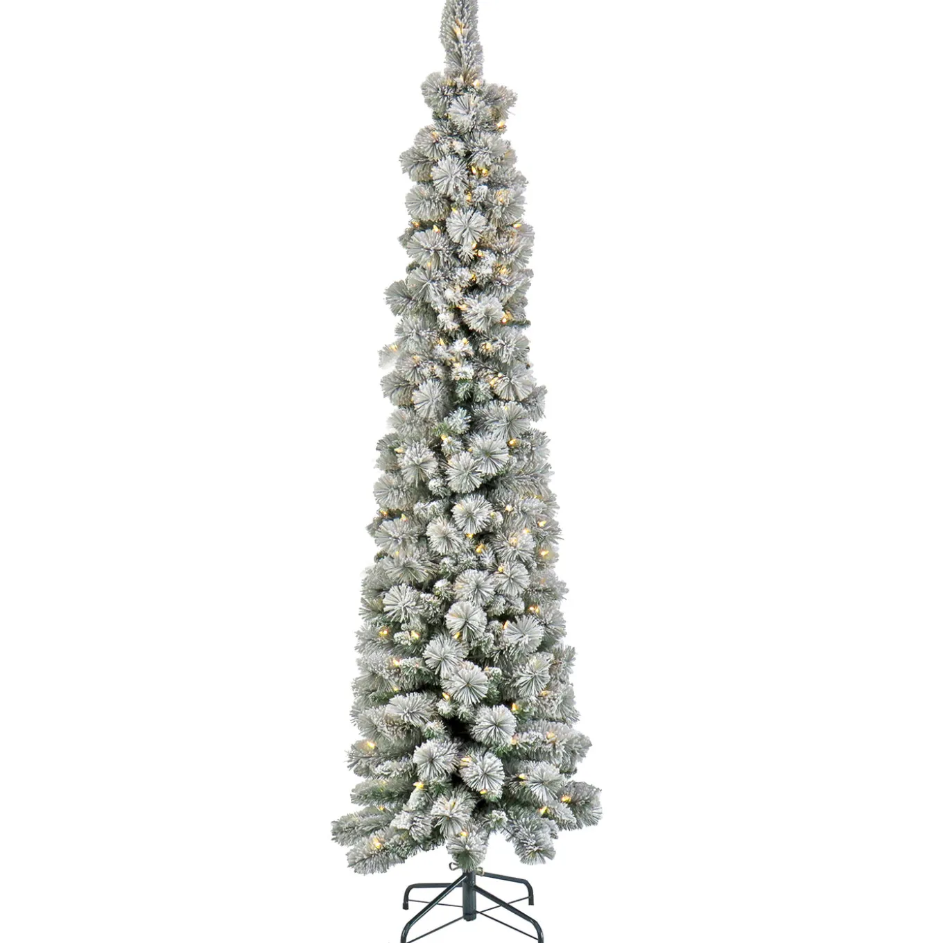 The Snowy Methow Pencil Slim tree offers an extra thin profile making it a great choice for display in corners or in areas where floor space is limited. It features flocked branches for the look of freshly fallen snow, and is pre-lit with 300 warm white LED lights that are long lasting and energy efficient. Crafted with high quality materials and hinged branches for easy set up and includes a sturdy metal folding stand. For indoor display only.