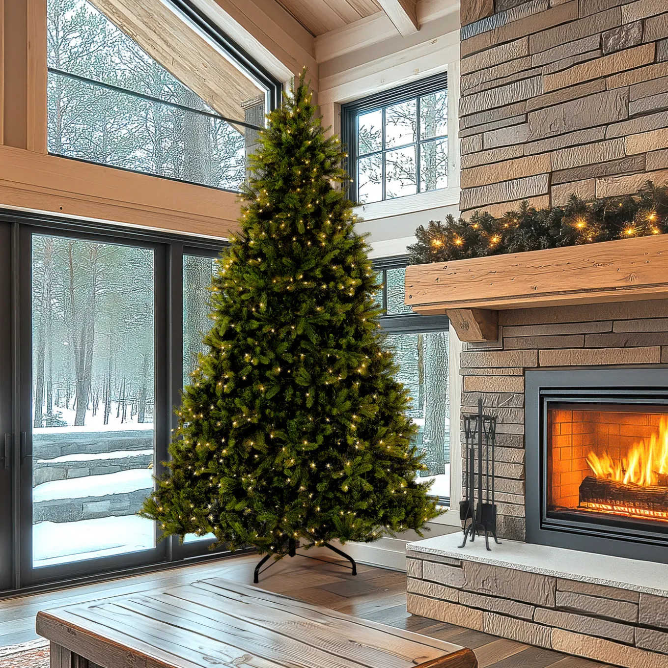 A large room needs a large tree and at 10 ft. tall, this Downswept Douglas may be the perfect choice. This evergreen features Feel Real branch tip technology, creating a tree with remarkable realism. These crush-resistant branch tips are molded from real tree branches for an authentic living tree appearance. This tree is pre-strung with 1000 clear lights that remain lit even if a bulb burns out. This tree features hinged branch construction for ease of assembly. Sturdy metal tree stand is included.
