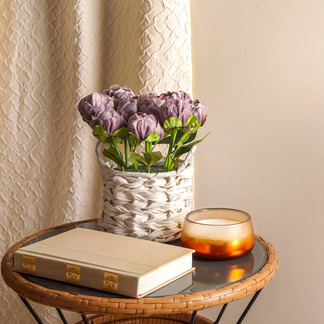 This bouquet of light purple peony flower blooms on leafy green stems rises from a white basket with a wide weave and two loop handles. The flowers are seated in a simulated soil surface. Add a burst of color to tabletop trimmings with these attractive artificial flowers that are remarkably life-like yet maintenance-free. For decorative indoor display.