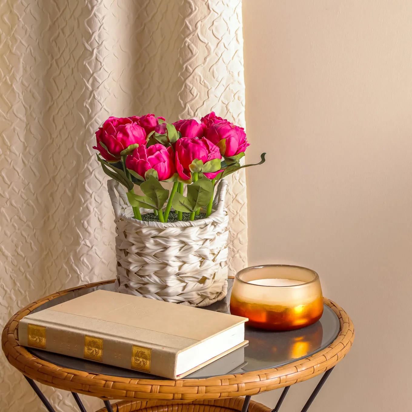 This bouquet of pink peony flower blooms on leafy green stems rises from a white basket with a wide weave and two loop handles. The flowers are seated in a simulated soil surface. Add a burst of color to tabletop trimmings with these attractive artificial flowers that are remarkably life-like yet maintenance-free. For decorative indoor display.