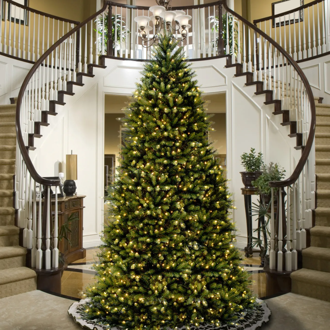 A large room needs a large tree and at 14 foot. tall, they don’t get much bigger than this Dunhilll Fir. This full body tree features a generous number of branch tips for holding holiday trimmings. Hinged construction and included metal tree stand add to ease of assembly.