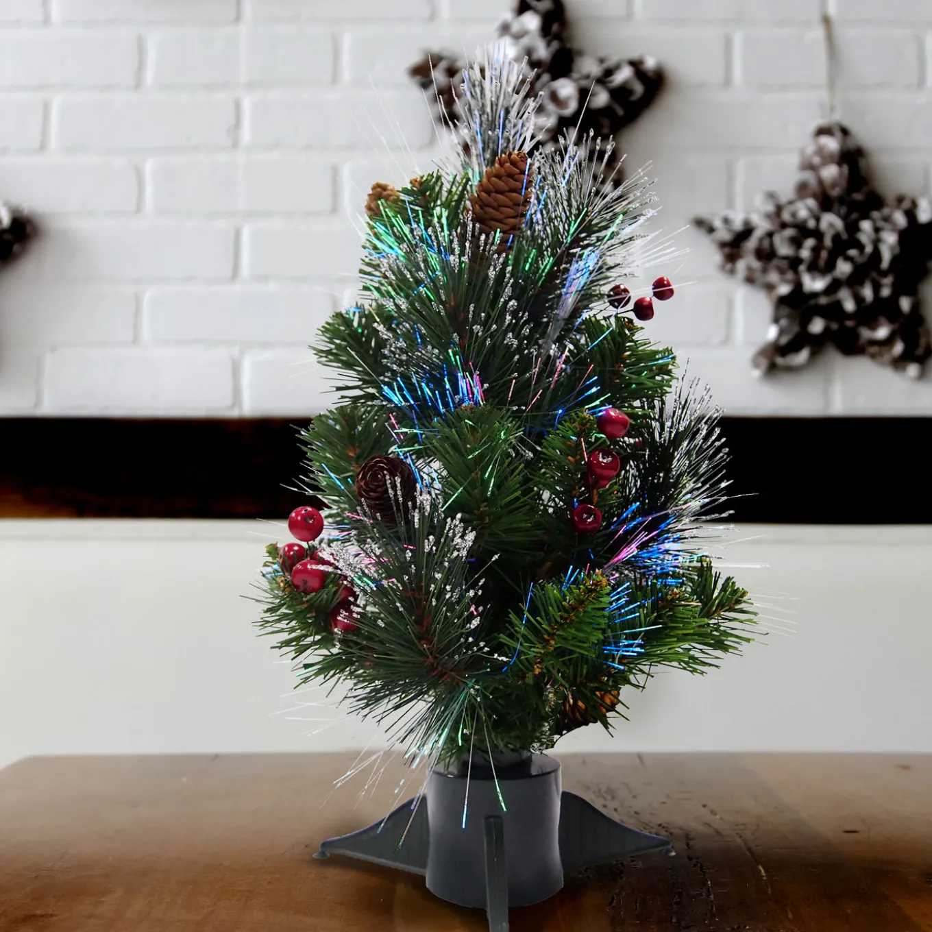 This attractive and compact Fiber Optic Ice Crestwood Spruce tree features sparkling, color-changing fiber optic lights. It is battery-operated and lit from a single bulb in the tree base. This tree is trimmed with silver bristle, red berries and pine cones for added charm. For indoor display only.