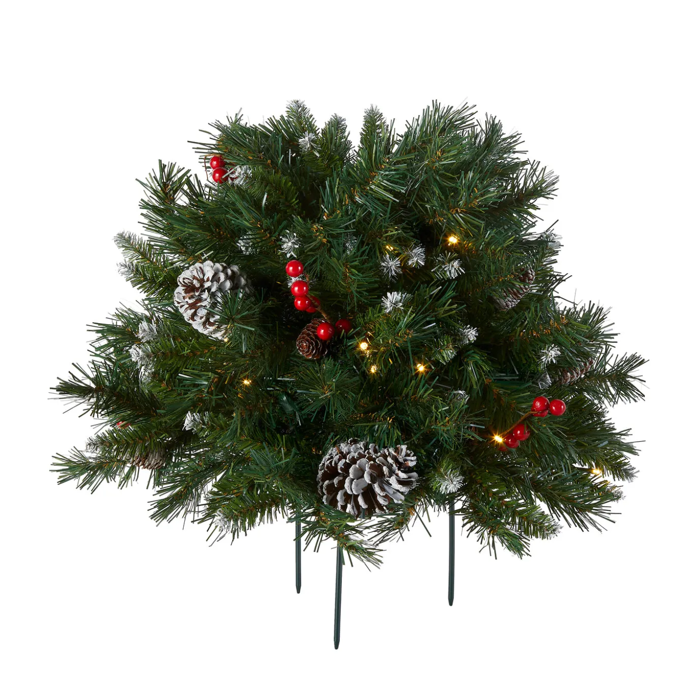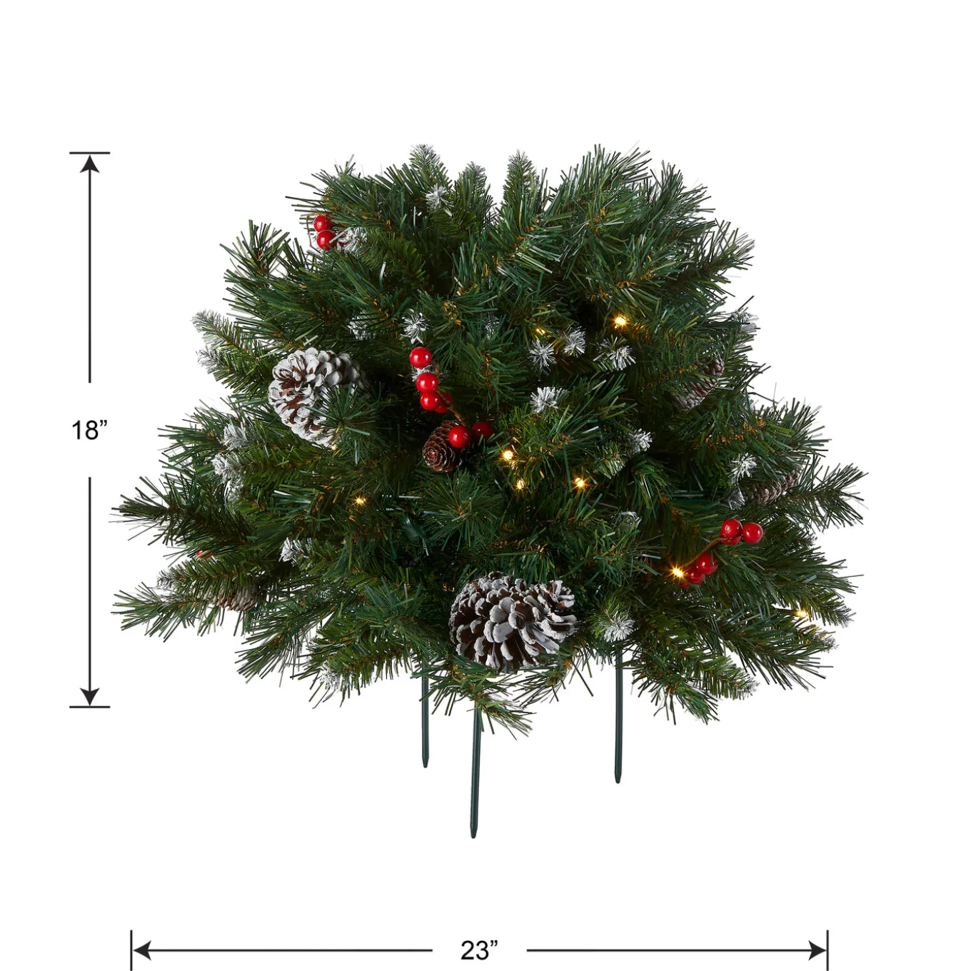 Designed for filling decorative urns and pots, this Frosted Berry Urn Filler spray of evergreen branch tips is trimmed with white-tipped pine cones and red berries. It is pre-lit with 35 battery operated warm white LED lights that are energy-efficient and long lasting. 6 hours ON/18 hours OFF timed operation. Included is a 3-prong metal stake for propping up the filler in an empty container or for inserting into soil. For indoor or covered outdoor display.