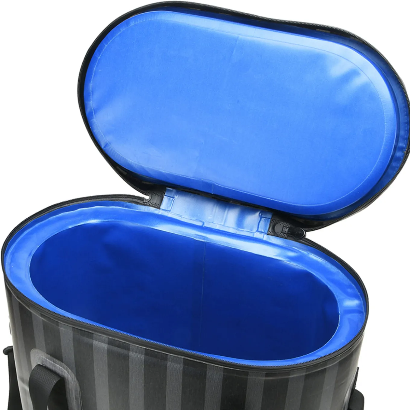 Pack up for a day on the move with this stylish large capacity cooler bag features a waterproof polyester exterior in gray striped pattern. Carry handles and adjustable shoulder strap offer convenient carrying options.
