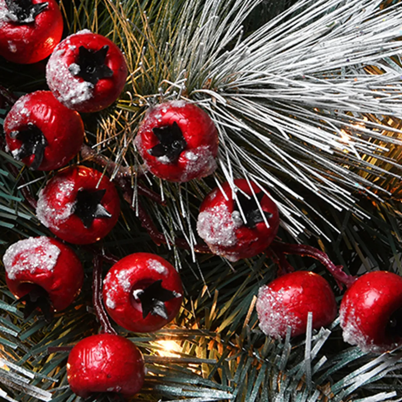 This Snowy Glacier Pine is great for tabletop display or for adding holiday cheer to children’s or secondary room. It is seated in a burlap bag base and features snow sprinkled branch tips trimmed with pine cones and clusters of red berries. This tabletop tree is pre-lit with 35 warm white battery operated LED lights with an integrated 6 hours ON/18 hours OFF lights timer included. For indoor display.