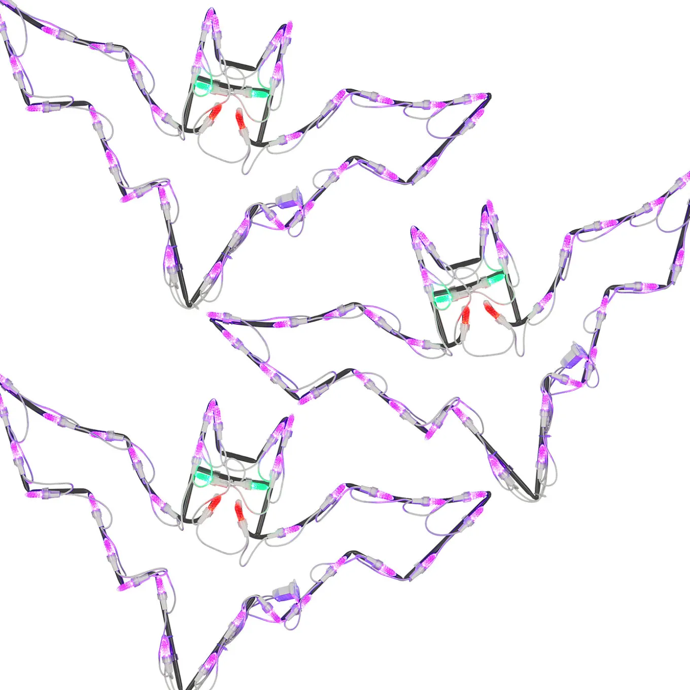 - The decoration depicts a frame shaped in the outline of flying bats. The lights attached glow brightly in a combination of purple, yellow and red bulbs. To power the lights, simply plug into the nearest wall outlet