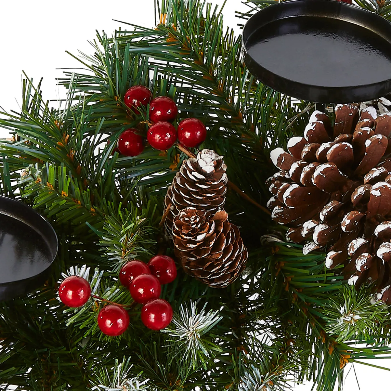- This fantastically festive artificial plant features leafy greens with clusters of red berries and pine cones for added natural appeal, displayed on a candle holder centerpiece
