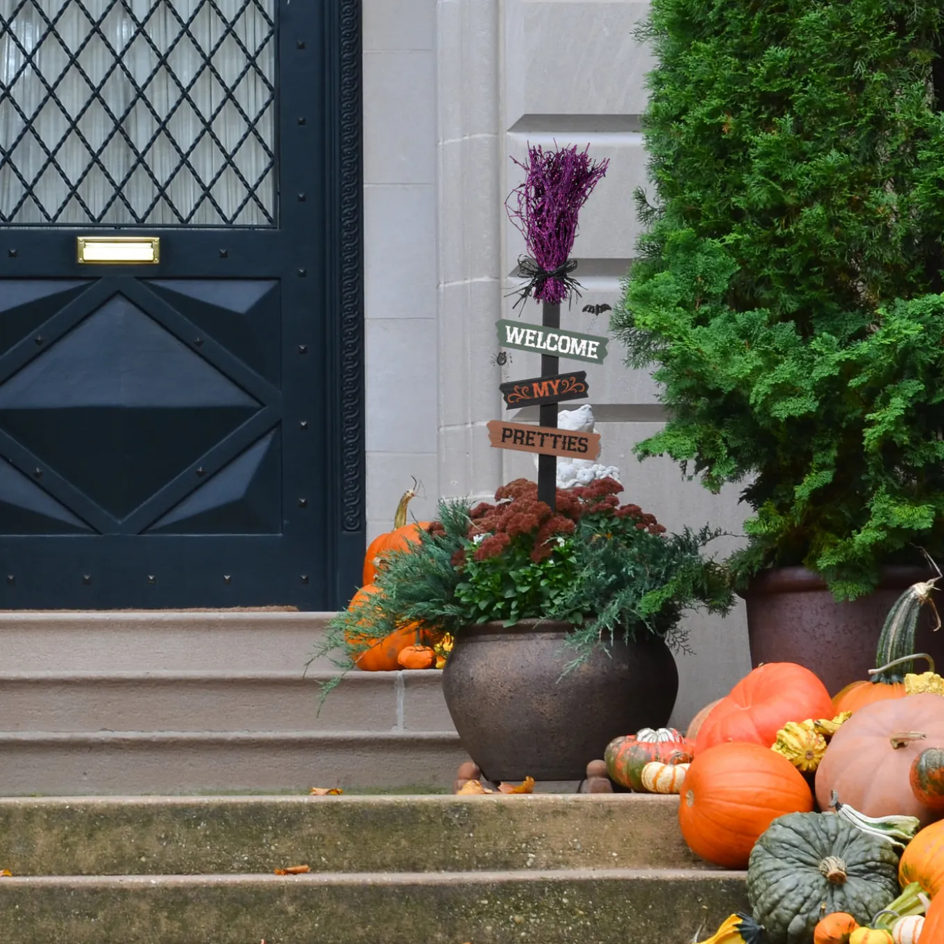 Constructed of lightweight wood and wood composite materials this Halloween decoration invites trick-or-treaters to draw nearer. Topped with a stringy tangle of bright purple and glittered branch twigs it is also mimics a road sign with a sinister saying.