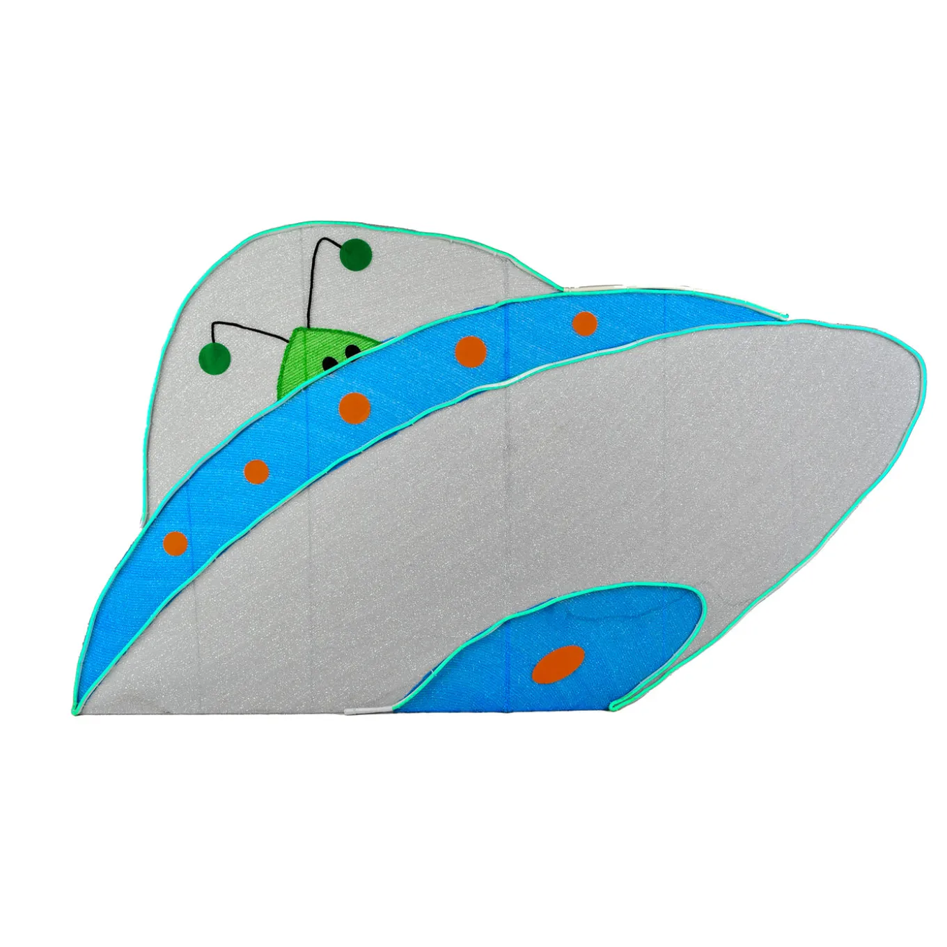 - Includes one Pre Lit Alien Spaceship Decoration that measures 35 inches in height and 64 inches in width and are constructed of tinseled fabric over sturdy wire frames and hundreds of LED lights on neon style light strips