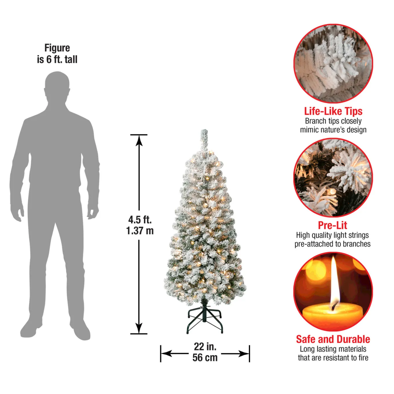 The Acacia tree offers a slim profile tree that is great for display in corners, small rooms and areas with limited space. This tree features flocked branches giving the appearance of freshly fallen snow. It ispre-lit with 100 clear lights that remain lit even if a bulb burns out. This tree features hinged branches for ease of assembly. Sturdy folding metal tree stand is included.