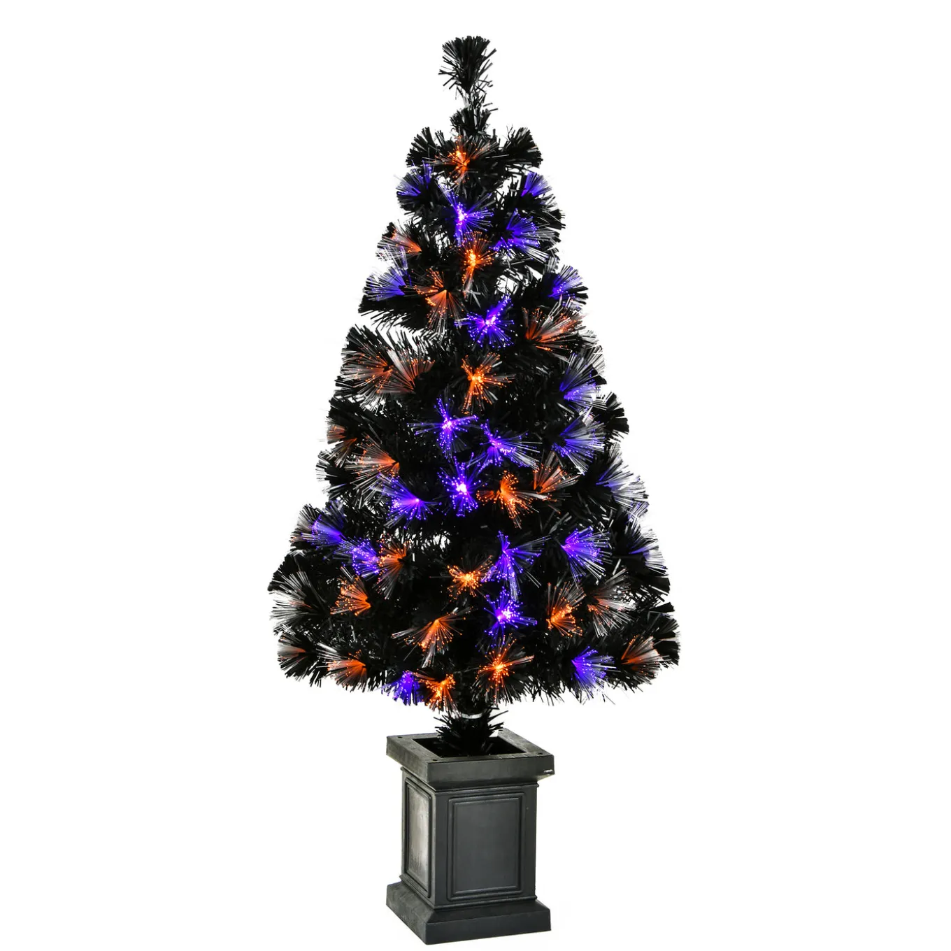 - Includes one Pre Lit Artificial Tree Decoration that measures 4 feet in height and 2 feet in diameter at the base and features 125 branch tips with purple and orange fiber lights