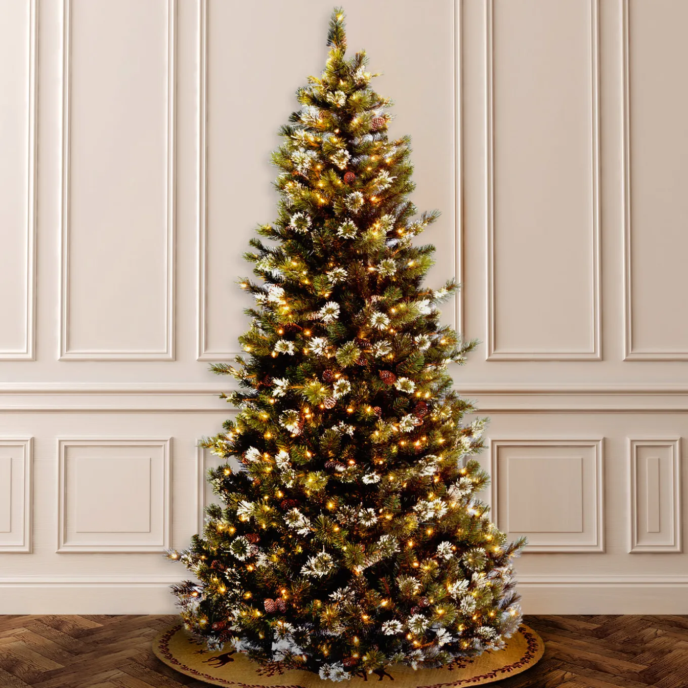 The Glittery Pine is an evergreen tree mixed with bristle branches that is trimmed with pinecones and features snow-sprinkled branch tips. It is pre-strung with 900 clear lights that remain lit even if a bulb burns out. This four section tree features hinged branches for ease of assembly. Sturdy folding metal tree stand is included.