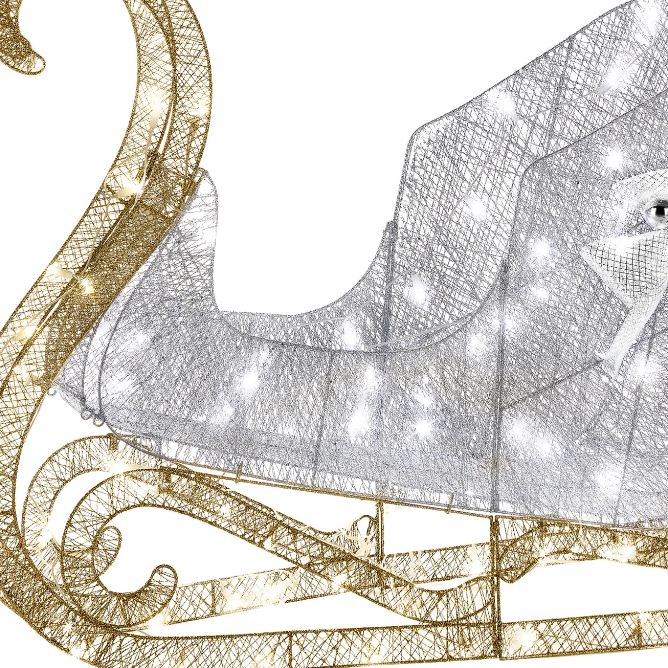- Includes one 48 inches in length silver and gold Santa’s Sleigh with ribbon and ornaments. To power the lights, simply plug in to the nearest wall outlet
