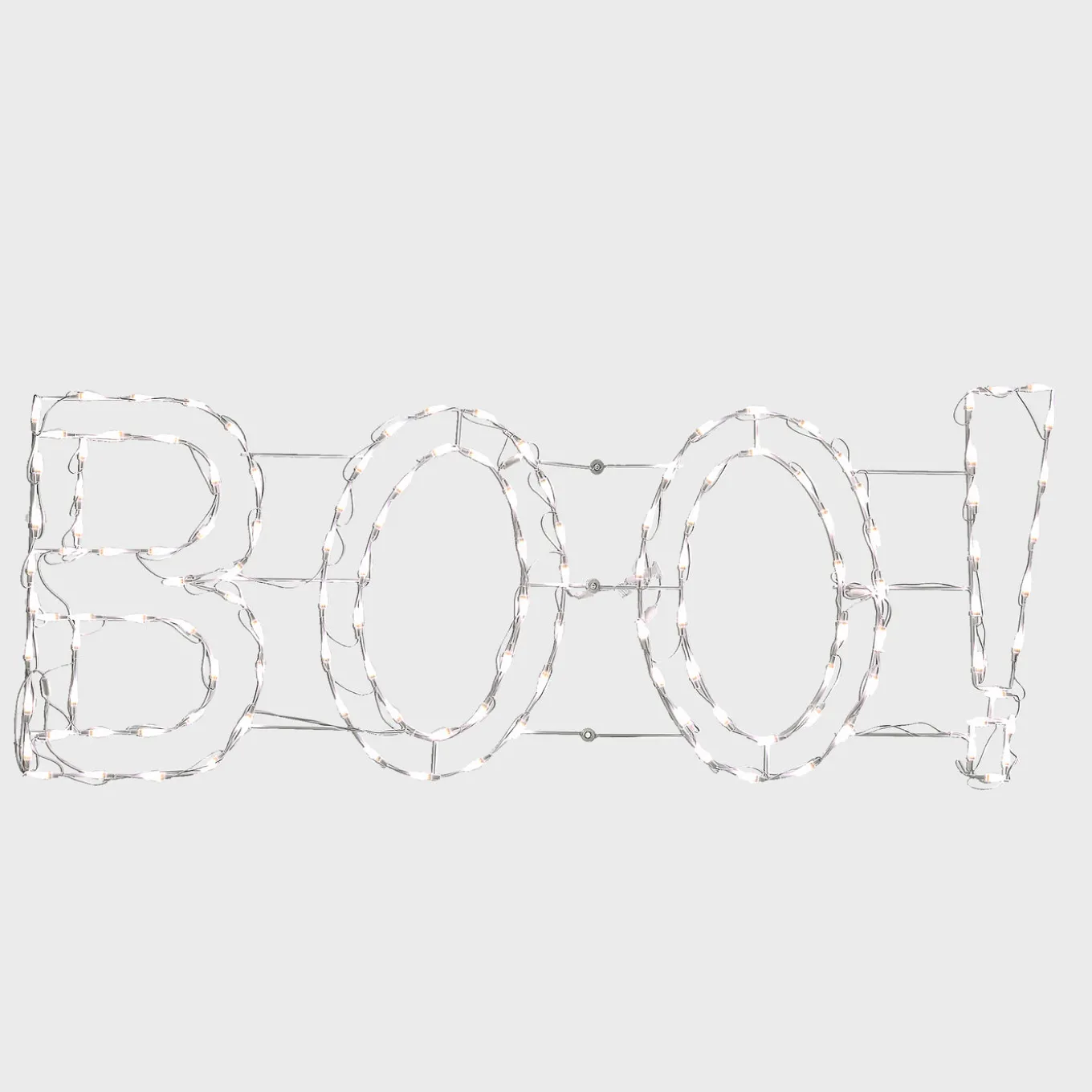 - The decoration depicts a frame shaped in the outline of a sign reading ‘BOO’. The lights attached glow brightly with white bulbs. To power the lights, simply plug into the nearest wall outlet