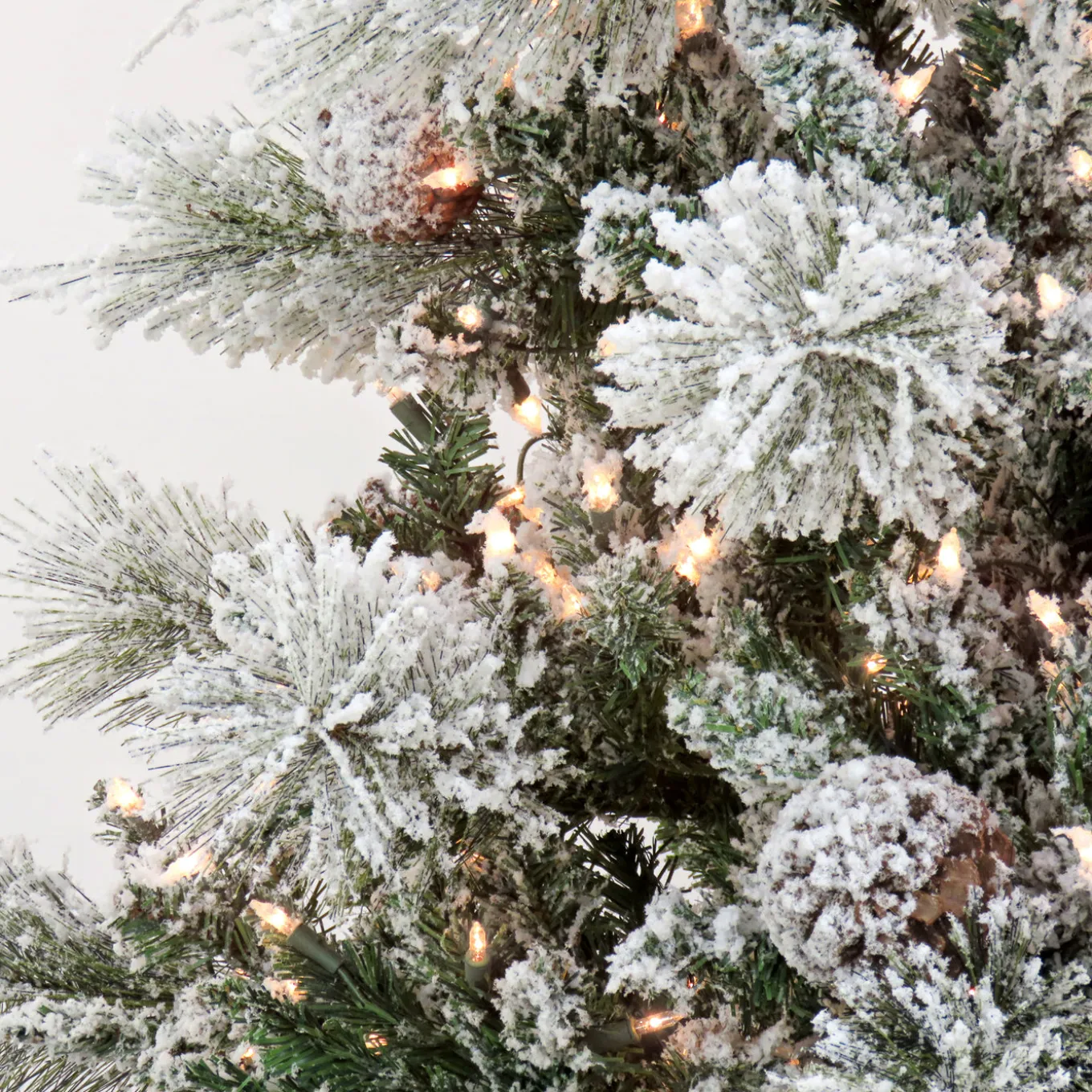 The Snowy Yorkshire tree is a mixed bristle tree that features flocked branches for the look of freshly fallen snow. It is pre-lit with 650 clear lights that remain lit even if a bulb burns out. Crafted with high quality materials and hinged branches for easy set up and includes a sturdy metal folding stand. For indoor display only.