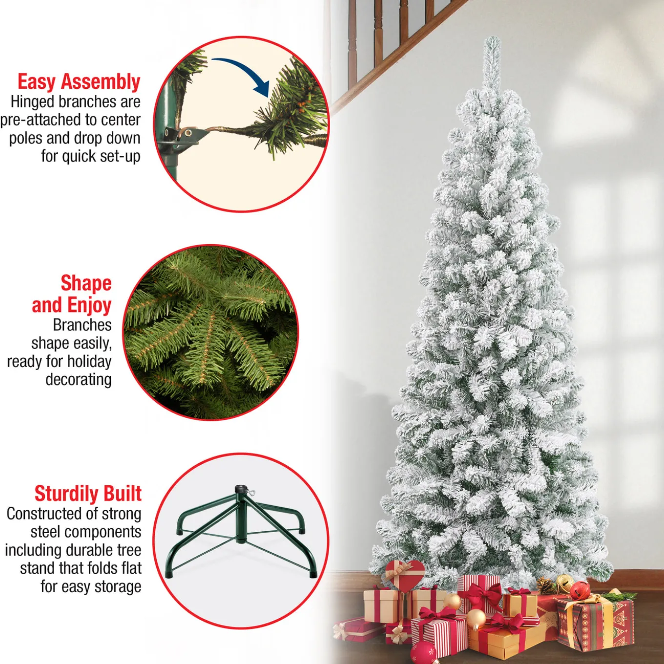The Acacia tree offers a slim profile tree that is great for display in corners, small rooms and areas with limited space. This tree features flocked branches giving the appearance of freshly fallen snow. This tree features hinged branches for ease of assembly. Sturdy folding metal tree stand is included.