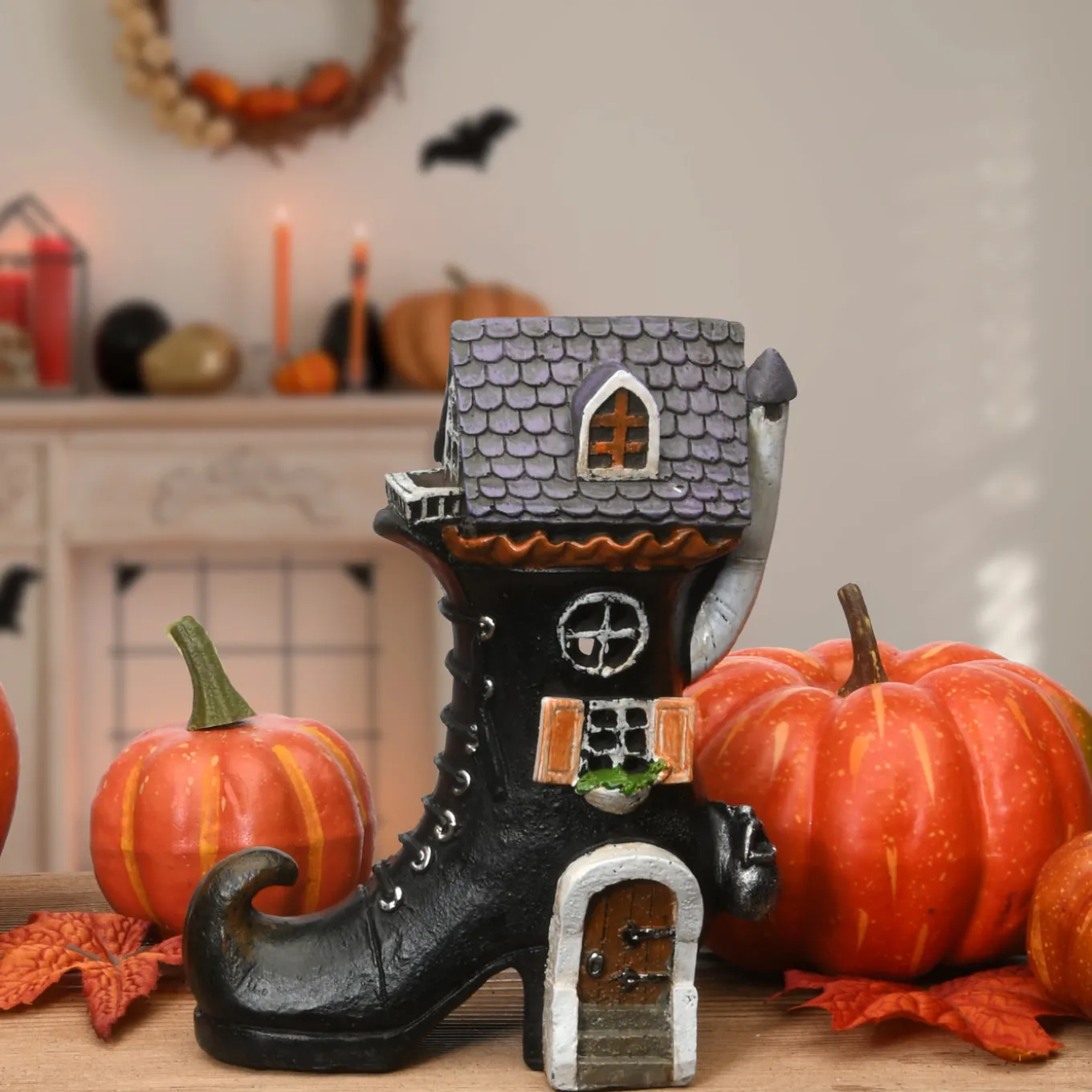 - Halloween themed decorative statue depicting a haunted boot house overrun by ghosts. One LED light illuminates the decoration.
