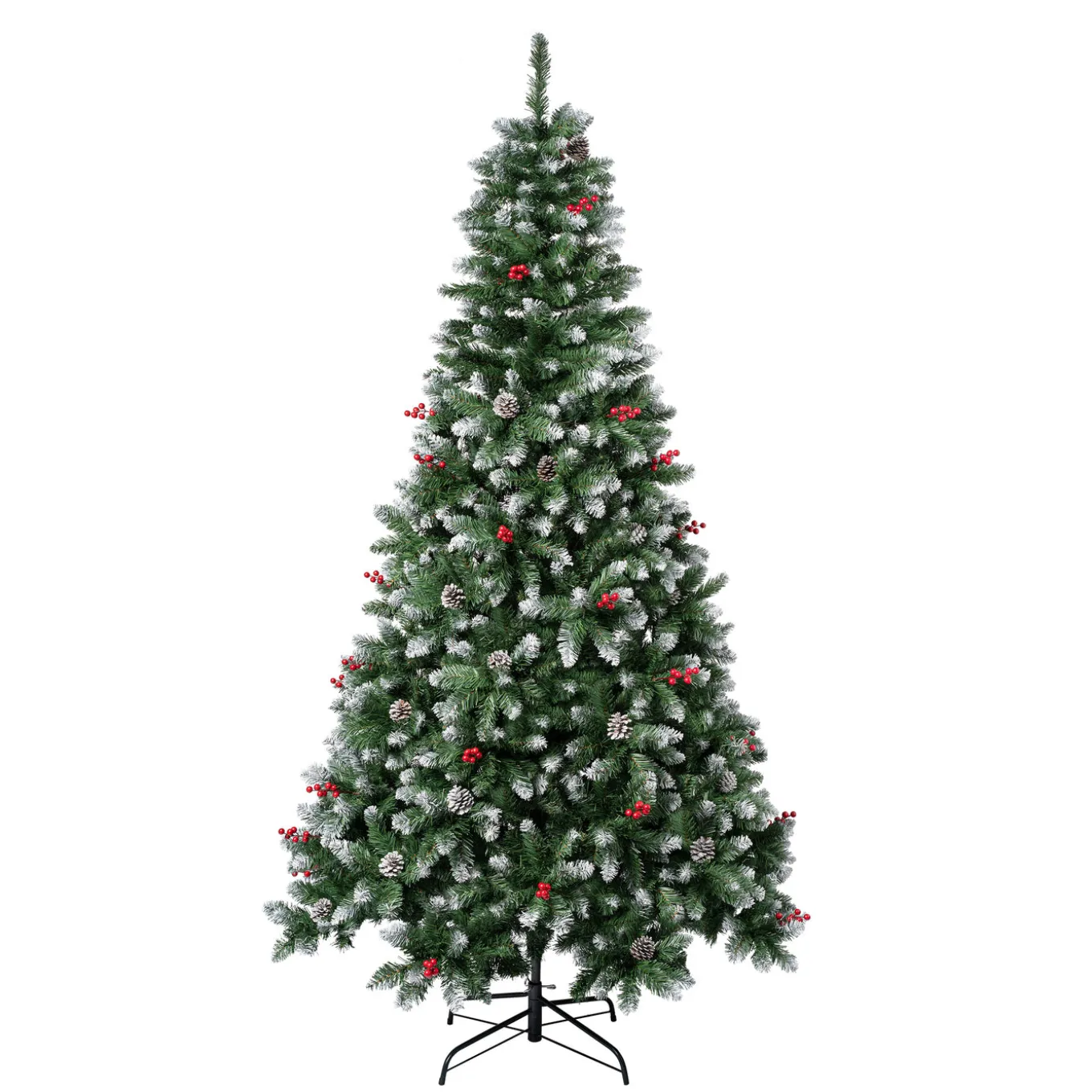 The Cullen Pine tree features flocked branches giving the appearance of freshly fallen snow. It is trimmed with pine cones and red berries. Crafted with high quality materials and hinged branches for easy set up and includes a sturdy metal folding stand. For indoor display only.