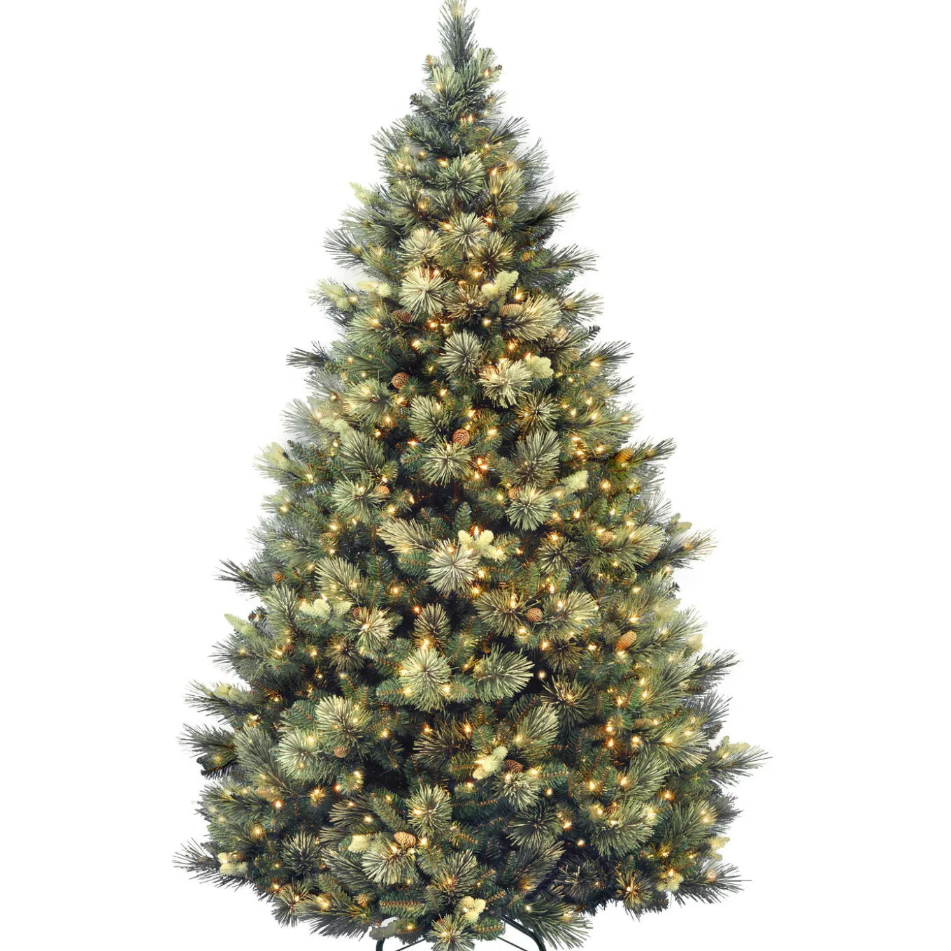 This Carolina Pine tree features mixed bristle and cashmere branch tips for an overall softer appearance. It is trimmed with pinecones for added natural appeal and is pre-strung with 1000 clear lights that remain lit even if a bulb burns out. This tree features hinged branch construction for ease of assembly. Sturdy folding metal tree stand is included.