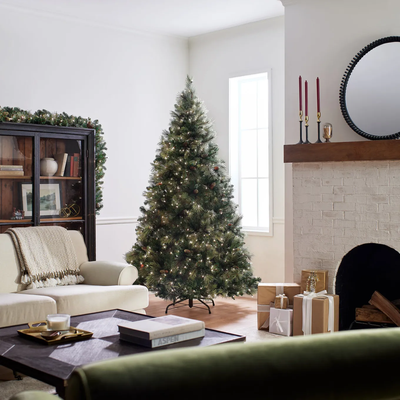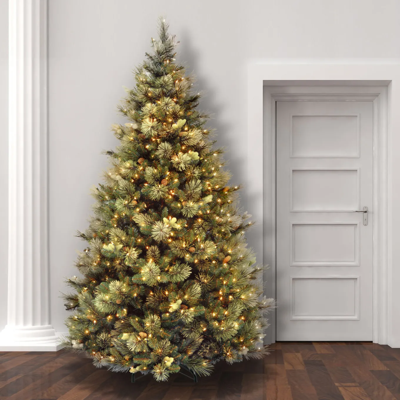This Carolina Pine tree is a full body tree featuring mixed bristle and cashmere branch tips and is trimmed with pinecones. It is pre-strung with 750 clear lights that remain lit even if a bulb burns out. This tree features hinged branches for ease of assembly. Sturdy folding metal tree stand is included.