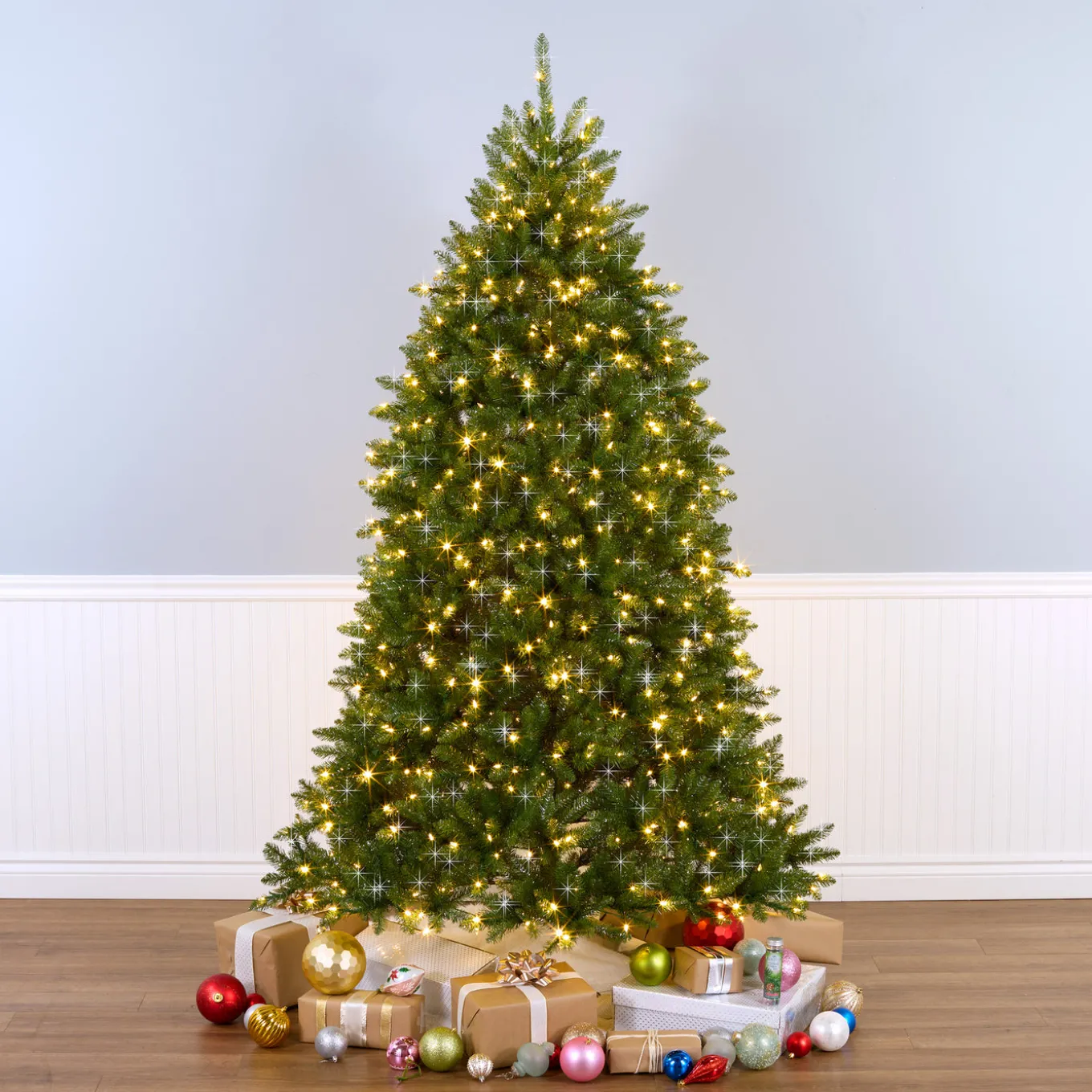Fall in love with this Dunhill Fir Shimmer artificial Christmas tree. Designed with silver tinsel to bring the ultimate holiday shine. This tree is Pre-Lit with 700 Dual Color LED lights with 10 functions and features PowerConnect System through-the-pole lighting system. Crafted with high quality materials and hinged branches to easy set up and a metal folding stand.