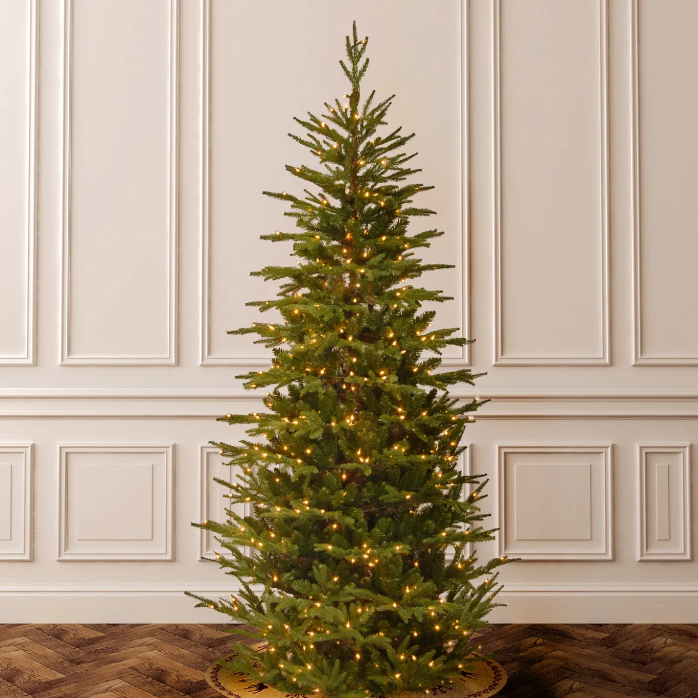 This Frasier Grande tree features Feel Real branch tip technology, creating a tree with remarkable realism. These crush-resistant branch tips are molded from real tree branches for an authentic living tree appearance. This tree is pre-strung with 600 clear lights that remain lit even if a bulb burns out. The slim profile design allows for display in corners or limited space areas. This tree features hinged branch construction for ease of assembly. Sturdy metal tree stand is included.