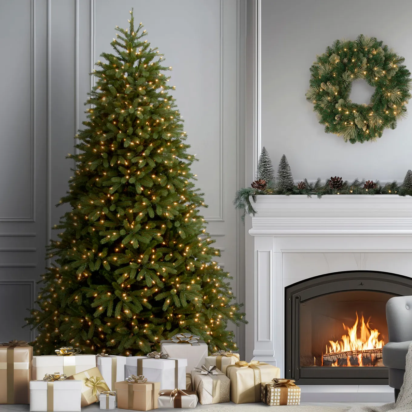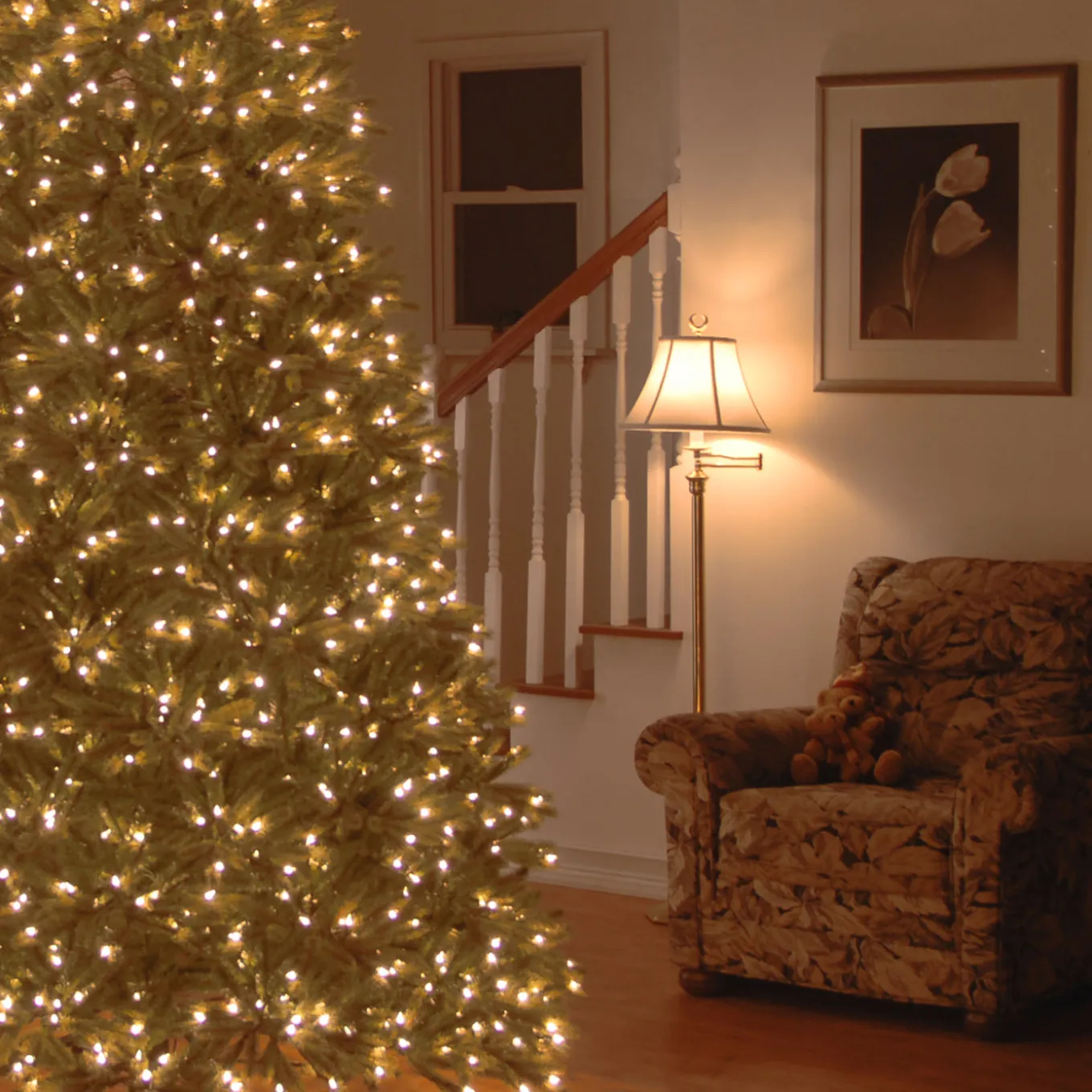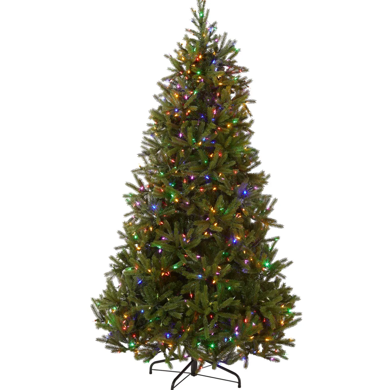 The Jersey Fraser Fir tree features Feel Real branch tip technology, creating a tree with remarkable realism. This tree is pre-strung with 1000 Dual Color lights that change from warm white to multicolor with the touch of a button. Included is a foot pedal switch to control 10 different light colors and actions. The medium width of this tree may be a better fit in areas where floor space is limited. This tree features hinged branch construction for ease of assembly. Sturdy metal tree stand is included.