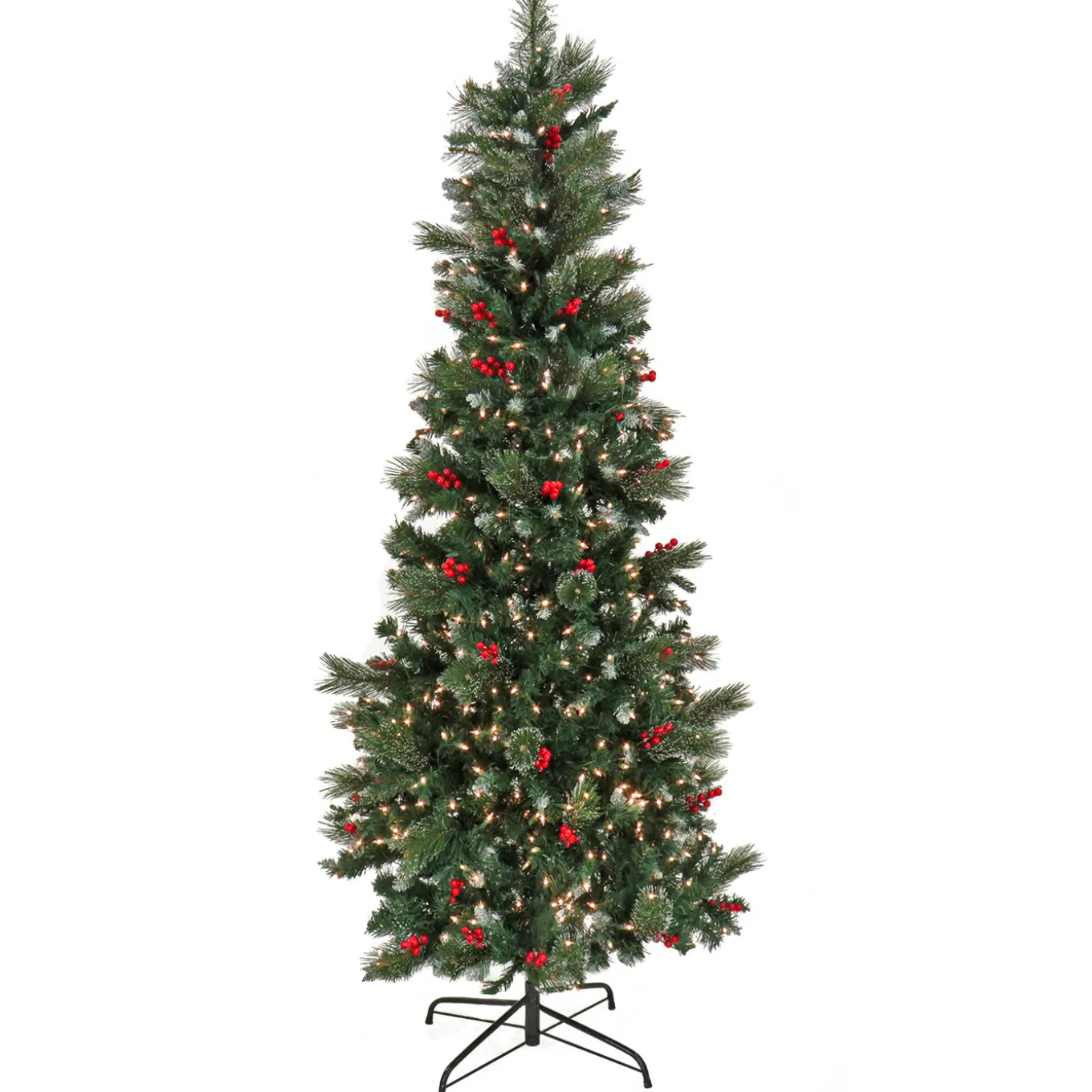 The Meadowlark Pencil Slim tree is a welcoming must-have to any entryway or home. This simple, yet elegant holiday tree features a slim silhouette and pre-lit with 750 clear lights to create a festive holiday glow perfect for rooms with limited space or can enhance an already decorated room. Trimmed with red berries and designed with hinged branches for easy assembly. Includes a sturdy metal folding stand. For indoor display only.
