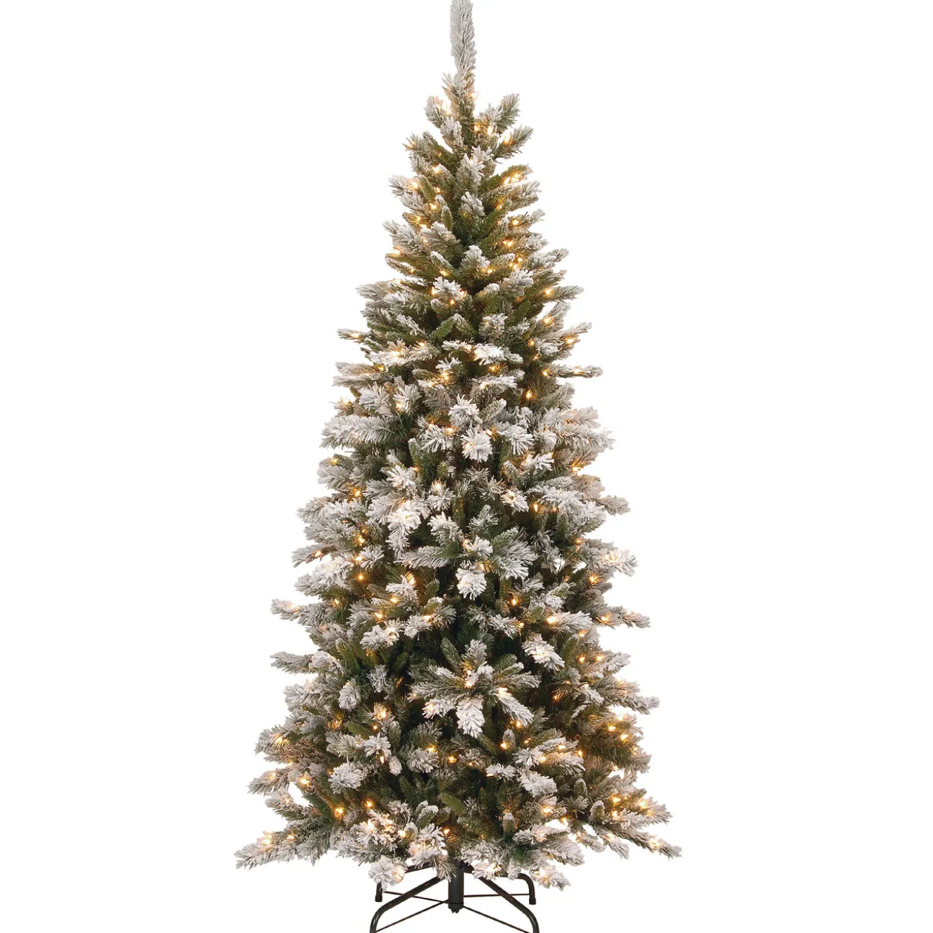The Snowy Mountain Pine Slim is a thin profile tree that is a great choice for display in corners or areas with limited space. It features mixed tip branches that are lightly flocked to give the appearance of freshly fallen snow. This tree is pre-strung with 500 clear lights that remain lit even if a bulb burns out. This tree features hinged branch construction for ease of assembly. Sturdy metal tree stand is included.