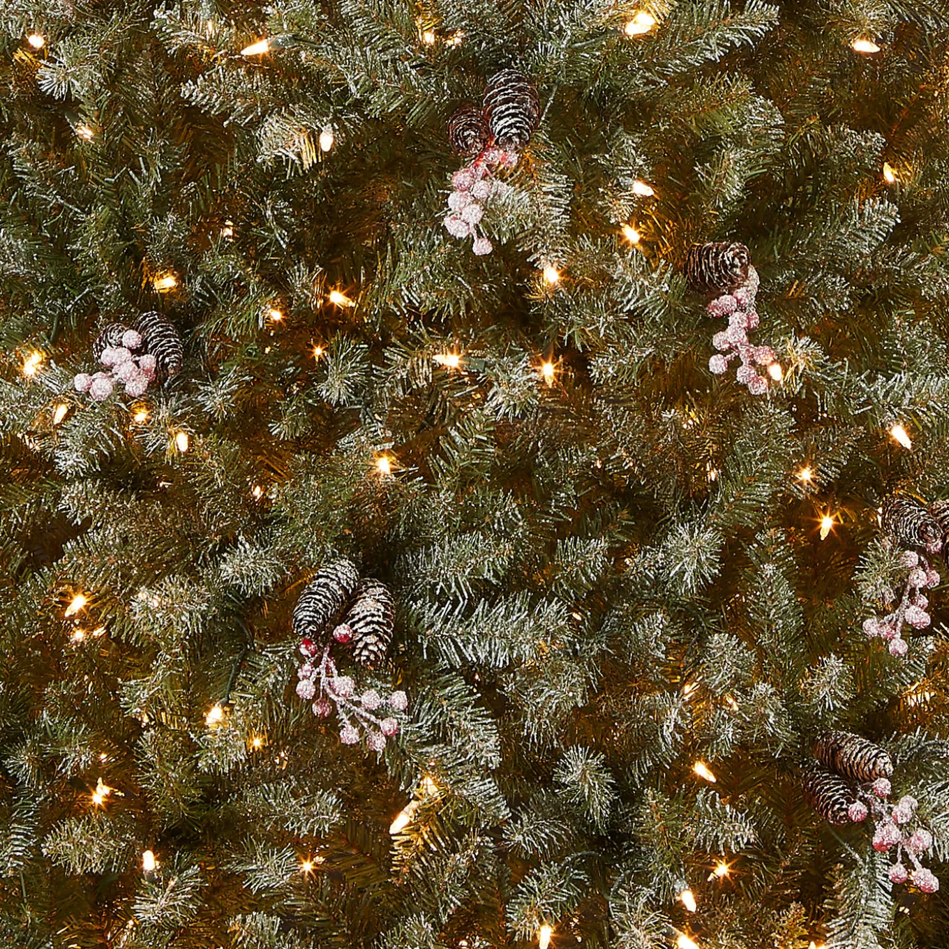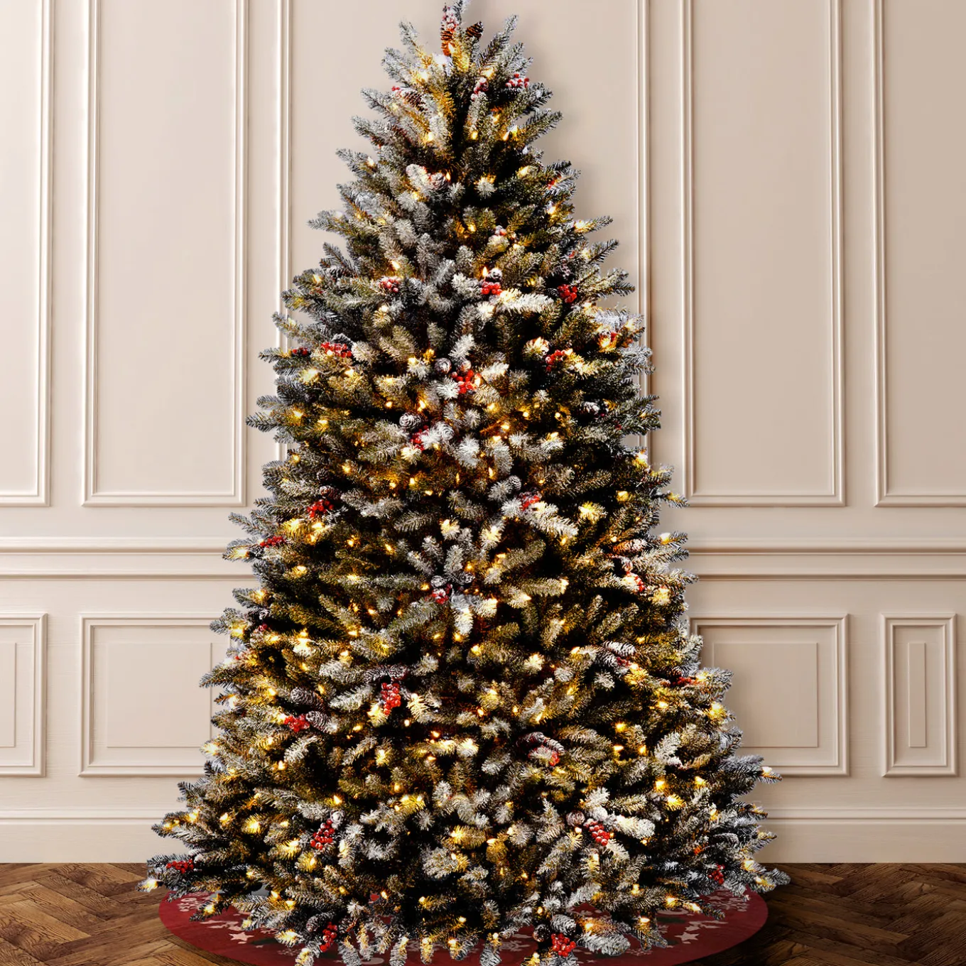 The Dunhill Fir tree features snow sprinkled branch tips and is trimmed with clusters of red berries and pinecones. It is pre-strung with 700 clear lights that remain lit even if a bulb burns out. This tree features hinged branch construction for ease of assembly. Sturdy metal tree stand is included.